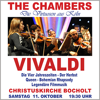 Sie müssen keine Weltreise unternehmen, um das Klassikkonzert eines Weltklasse-Orchesters zu hören. Am 11. Oktober um 19:30 Uhr sind “The Chambers” zu Gast in der Christuskirche. Die vom Meisterviolinisten Artiom Kononov handverlesenen Musiker, die aus verschiedensten Ländern abstammend heute alle in Köln ansässig sind, treten seit dem Jahr 2015 unter dem Namen “The Chambers – die Virtuosen aus Köln” auf.