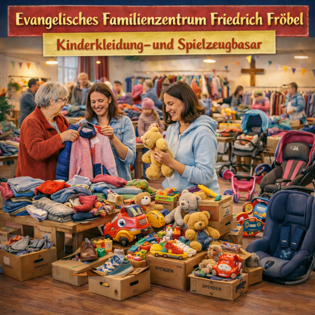 Das Evangelische Familienzentrum Friedrich Fröbel lädt herzlich zum nächsten Kinderkleidung- und Spielzeugbasar ein. Dieser findet am Freitag, den 20. März 2026, von 16:30 Uhr bis 19:00 Uhr statt.