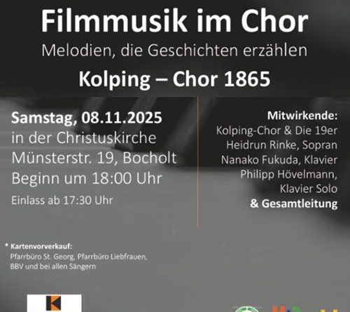 Am 8. November bringt der Kolpingchor in der Christuskirche zu Gehör, was entsteht, wenn ein Traditionschor die Musik großer Filme interpretiert. „Filmmusik im Chor – Melodien, die Geschichten erzählen“ lautet der Titel des Programms. Ein Wagnis und eine Premiere. So etwas hat der Kolping-Chor noch nie versucht. Herzliche Einladung am Samstag, 8. November um 18:00 Uhr in der Christuskirche.